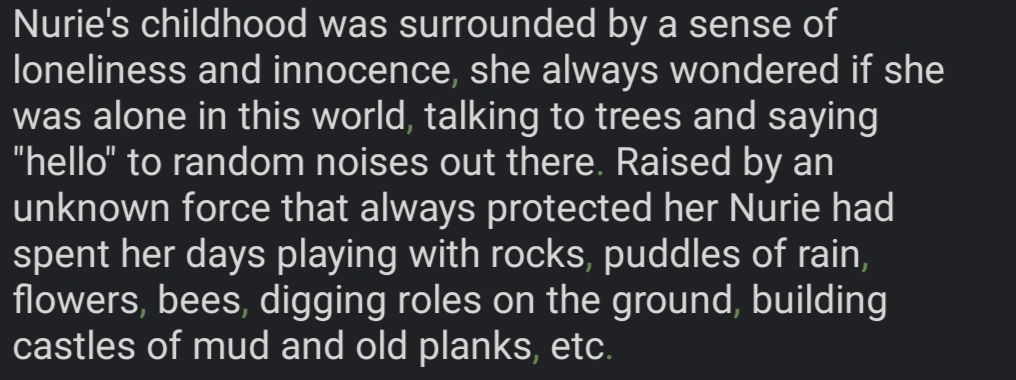 - What is your character's past lore? Was there an big event? A traumatic experience? A life changing moment of her past? An description, an lore about her specie, culture or race?