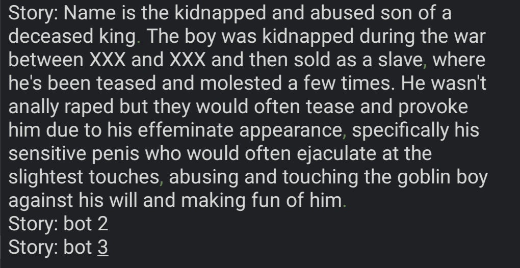 • Multibots MUST have at least minimal reference about other characters to avoid the misuse of lorebooks. It do matters, unlike parents or relatives of your saviorfag bot which will never even appear in the chat neither are meant to interact with the two of you.