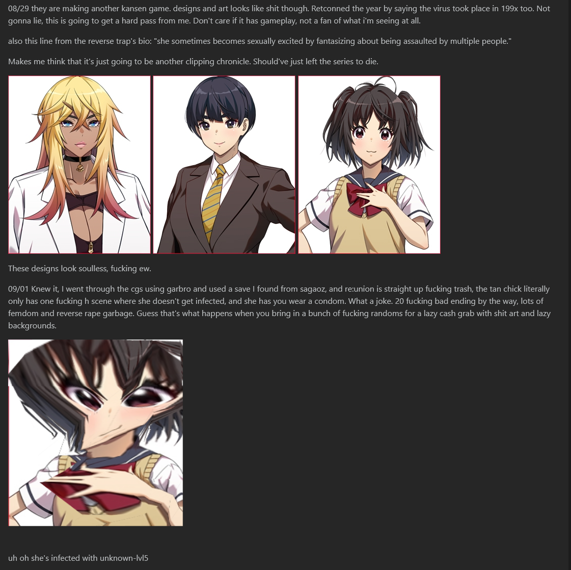 09/11 New update to the kansen card on chub. Added infected greeting as I was originally going to do it back in april, but forgot. The news about strawberry is a bit mixed as well, If it can translate vertical japanese i'll use it...but if it is filtered to shit then it's useless. We'll see what happens.