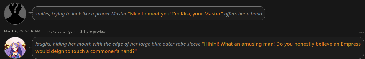 В сухом безжопе вся чатхистори названа сценарием визуальной новеллы. По причине говняного датасета вокруг "ролеплея" это сильно повышает качество аутпута, зачастую не только убирая разбор+эхо, но и делая ответы душевнее.