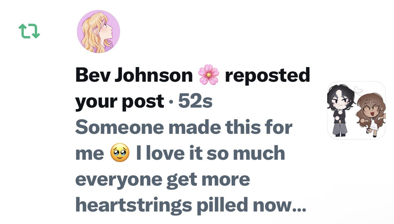 - 04/02/26: HOLY SHIT GUYS 😭😭😭😭 Someone made me free heartstrings art its so adorable I posted it onto Twitter because its so cute and Beverly freaking reposted my tweet omg