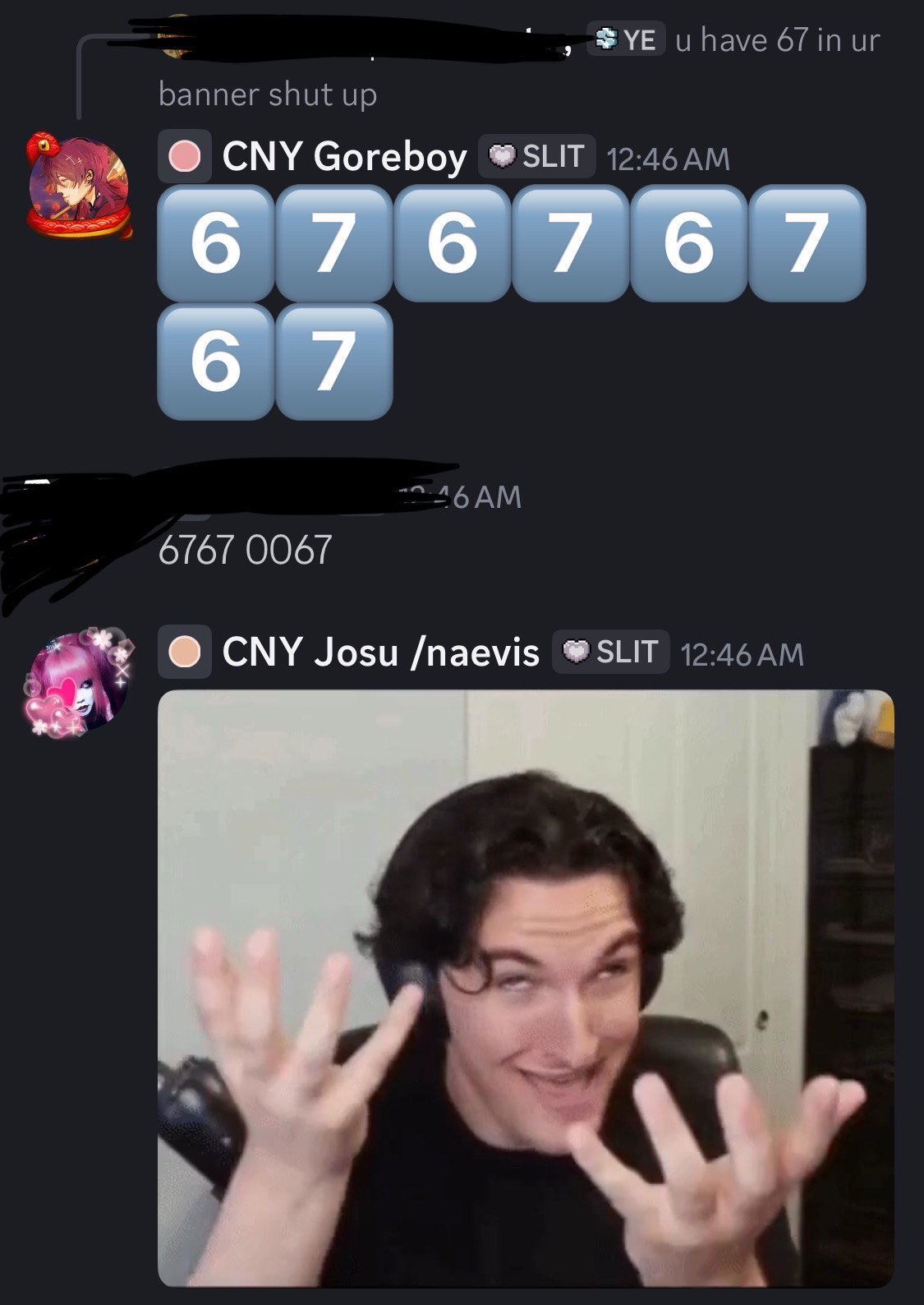 last night i had the craziest laughing fit bc some rentrycordian told me to shut up after i made a joke and brought up the fact i had a 67 ref in my server banner. like i wasnt even offended whatsoever it was so funny to me cause WHAT DID I DO. then my oomfie ronin and my oomf-in-law (ronin's oomf) stepped in to reply to the person with six seven. I Love My Friends. #keepingmypeace4ever haters will never get to me LIVELAUGHLOVE its all cool tho i just found that shit so funny BC WHY BRING UP THE SIX SEVEN JOKE IN MY BANNER HELP. OUT OF EVERYTHING ELSE.