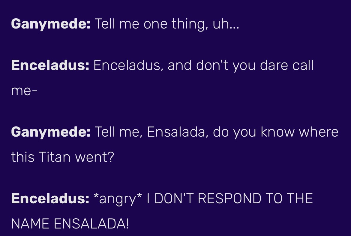 whejn i was also there i got to see on a telescope ANF THEY LET ME EXCLUSIVELY SEE GANYMEDE my chud teajcher told the guy my favourite moon is ganymede ANF THAT I FREAKING HATE TITAN WHO TOLD HIM TO SYA THAT, th guy said he would know me as number one titan hater i am Pleased :heart: