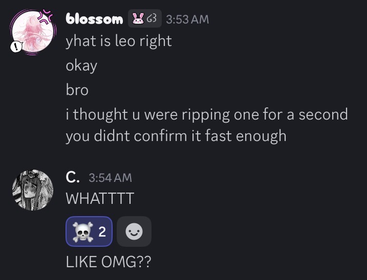 my name is cas, you can also call me annie or cassie. i go by she it pronouns. I do not mind masculine terms, and using the wrong pronouns will not upset or anger me! I am 16 years old, turning 17 on june 19. I am bisexual and genderfluid. I enjoy bsd, pjsk, squid game, hsr & more! i block & remove freely aswell. please always interact with extra care! I have no dni, however ill block or remove you if you are annoying, weird or if ur a zionist or if youre a person from my past, i have nothing to do with you or them. I am mentally unstable and socially awkward. I have manic depression and PTSD. I panic easily, have extreme mood swings, and struggle with memory loss, this affects how I communicate, and I get drained and stressed very easily. If this is something you cant handle, do not interact with me. I am diagnosed with bpd, adhd, and depression. There is more, but i choose not to list them for my own comfort. I also forget to check dms alot so please bump ur message. if you’ve heard anything about me, i’d rather you talk to me directly than assume. it helps avoid unnecessary misunderstandings, i think it’s the best way to avoid confusion. I have cognitive empathy and i struggle with sympathy alot, this affects the way i talk with others, i barely text first unless youre dion