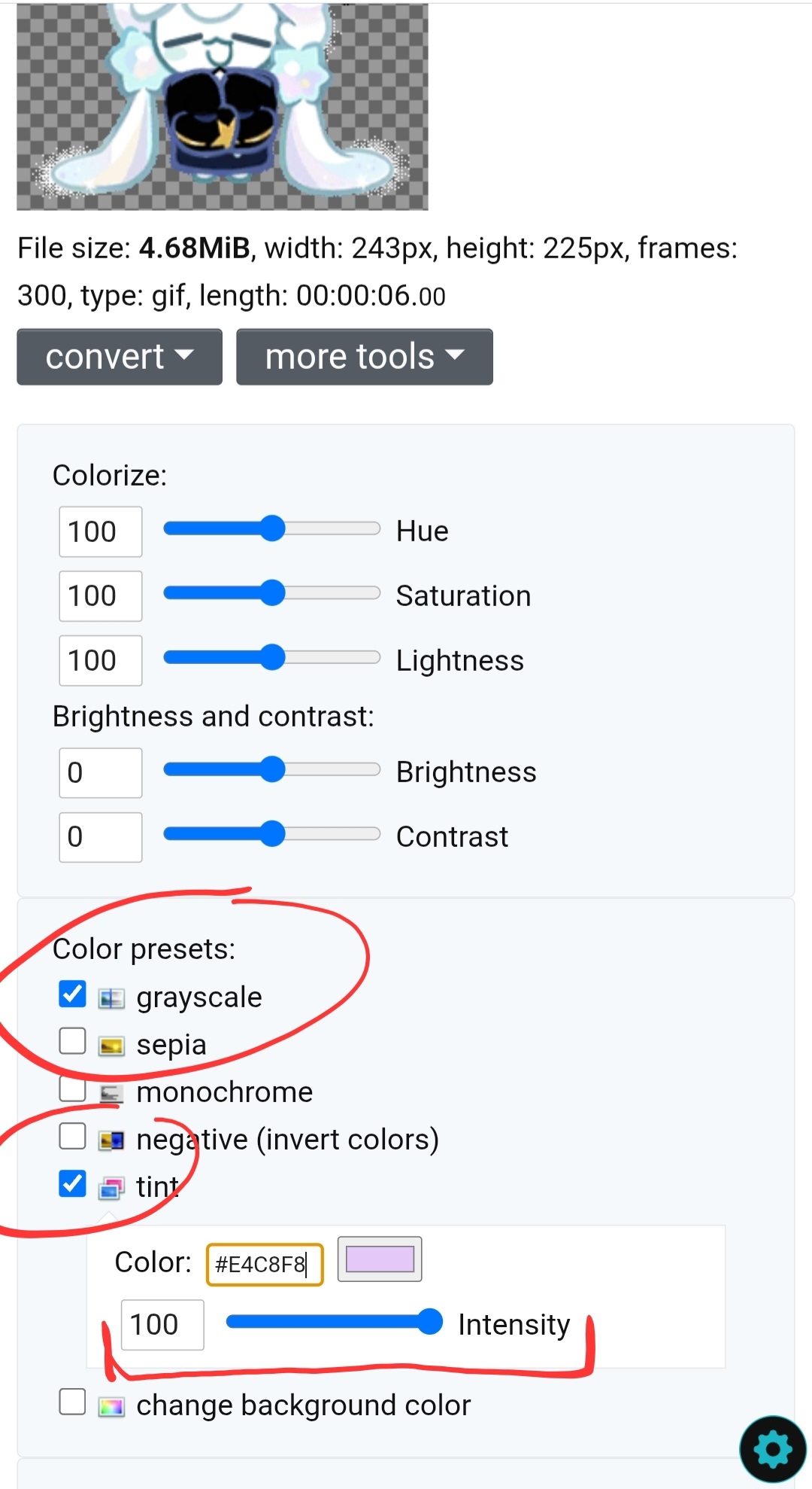 but in the event the gif is too light/dark scroll back up and adjust the brightness and contrast , instead of using the sliders i tend to type in the box to change the % applied and usually change it by 10% at a time , reloading the gif until i am happy with the result .