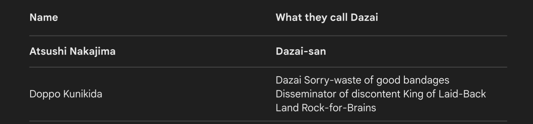 i love the way kunikida calls dazai a nickname that is something so humiliating, i wonder if dazai has ever thought about it and giggled during it
